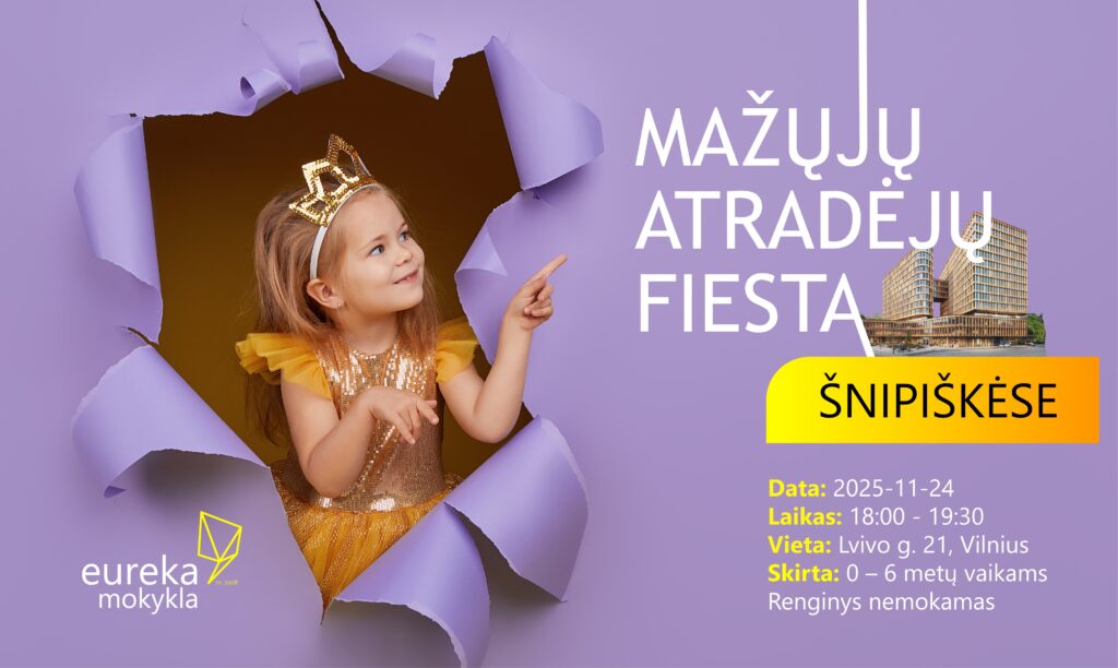 Šį kartą atradimais grįstą ugdymą pajausti galėsite „Mažųjų atradėjų fiestos“ metu lapkričio 24 dieną nuo 18:00 iki 19:30 val. Esate laukiami mokyklos „Eureka“ padalinyje, kuris įsikūręs naujai atidaryto verslo centre „Hero“ (Lvivo g. 21, Vilnius) antrajame aukšte.